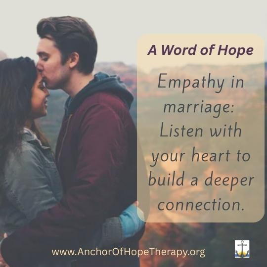 Practicing empathy can be challenging, especially in the heat of the moment when emotions run high or old habits take over. It takes intention and practice to shift from reacting to truly listening. At Anchor of Hope Therapy, we believe that healthy communication is one of the core foundations of a thriving marriage. Providing couples counseling as a couple, Stephen and I model what we teach and provide tools to grow in connection and communication. Our marriage counseling is designed to help couples refine their communication skills, fostering deeper connection and understanding. If you’d like to strengthen your ability to communicate in any relationship with empathy, contact us to begin your journey toward a more connected and fulfilling relationship.